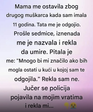 Teme suosjećanja, oprosta i roditeljstva često su vrlo emotivne, posebno za starije čitatelje. Ove priče opisuju unutarnje borbe, ljubav, odanost i zamršene obiteljske hijerarhije koje upravljaju našim ponašanjem i definiraju nas kao pojedince. U nastavku dijelimo s vama ispovijest žene koja je tijekom godina nosila težak emocionalni teret napuštanja, samo da bi potom doživjela povratak majke u svoj život, što je dovelo do novih pitanja o granicama, oprostu i osobnom spokoju. Djetinjstvo bez majke Kada je imala 11 godina, njezin se život značajno promijenio.